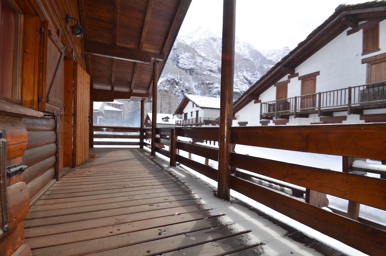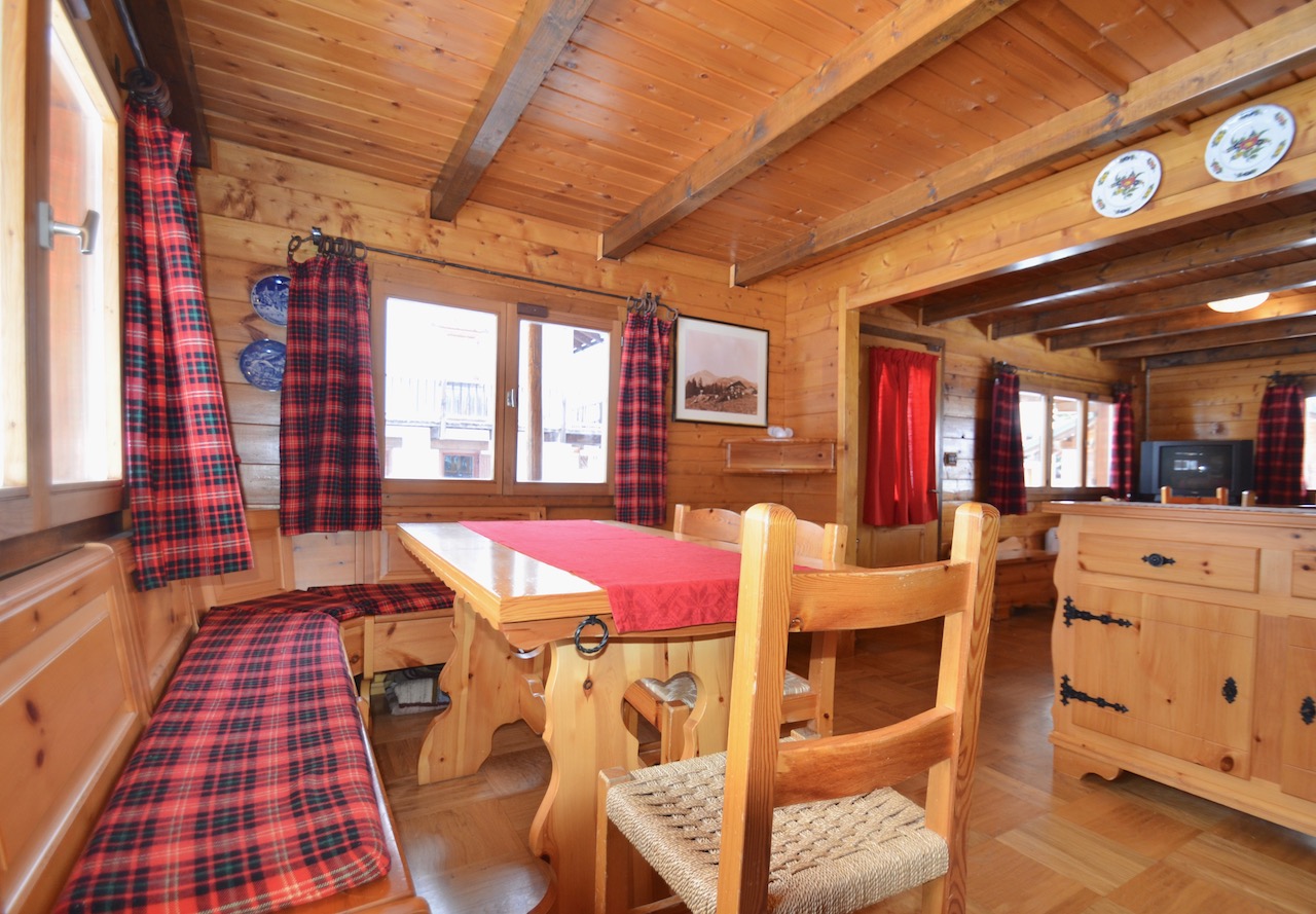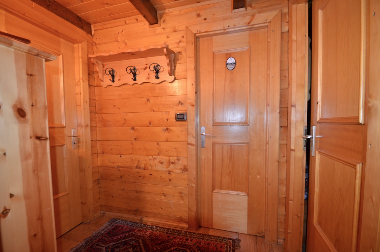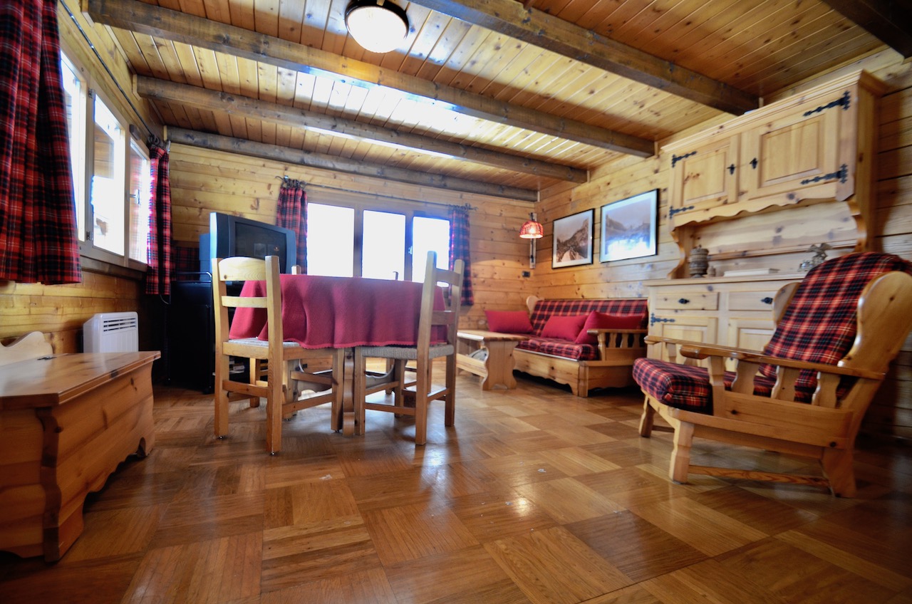 Edificato nella 1à metà degli anni ’80, l’immobile è costituito da un basamento seminterrato in muratura e piano rialzato prefabbricato in legno tipo “Blockhaus”. La tipologia costruttiva è in piena armonia con il contesto e coniuga elementi architettonici tipici della valle (pietra, legno e tetto in luserna). La zona abitativa si sviluppa interamente al Piano rialzato con: ingresso, soggiorno, angolo cottura, zona pranzo, disimpegno, n.2 camere da letto, bagno e terrazzo esposto a Sud. Al Piano terra: ampia autorimessa. Degna di nota la posizione strategica che consente l’accesso a piedi al comprensorio del Moterosa-Ski.